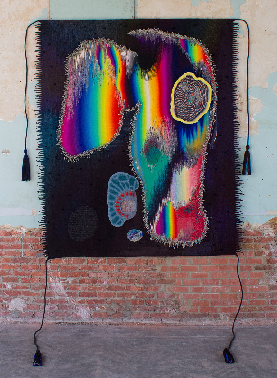 Mon parcours artistique commence par le dessin et la peinture, puis le tricot et la couture, l’impression et la reliure, le bois, le métal et le plastique, la céramique, le modelage, la restauration, la performance, le digital, la mode et le design, dans des réflexions et expérimentations variées. Je poursuis mon apprentissage dans les ateliers textiles des écoles d’art, où je trouve ma vocation. Aujourd’hui mon temps est consacré à tisser des tapisseries. Je les aime complexes et colorées, avec des fils fins et issus de matières naturelles, que j’entrelace encore et encore dans l’ouvrage. La progression de la trame d’une tapisserie est similaire à la sédimentation des sols, où les strates horizontales sont des fils de laine ou de soie. Chaque tapisserie requiert plusieurs mois de travail, et encapsule le temps investi. Je travaille sur plusieurs types de métiers à tisser, certains sont des cadres en bois munis de clous, certains sont improvisés, tridimensionnels, d’autres sont traditionnels, à ensouples, de haute ou de basse lisse. La nature de la fibre est de lier. Mon expérience de la tapisserie est une passerelle pour connecter tous les éléments qui me tiennent à cœur quand je tisse : la vie, le temps, l’espace-temps, l’espoir, l’illusion, la symbiose, l’arc-en-ciel.