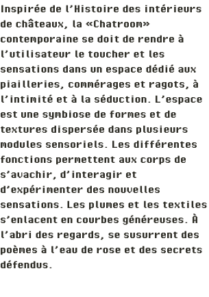 Chatroom / Boudoir, 2019 Design Academy Eindhoven graduation project tufting, tapisserie d’ameublement matières textiles dimensions variables Inspirée de l’Histoire des intérieurs de châteaux, la «Chatroom» contemporaine se doit de rendre à l’utilisateur le toucher et les sensations dans un espace dédié aux piailleries, commérages et ragots, à l’intimité et à la séduction. L’espace est une symbiose de formes et de textures dispersée dans plusieurs modules sensoriels. Les différentes fonctions permettent aux corps de s’avachir, d’interagir et d’expérimenter des nouvelles sensations. Les plumes et les textiles s’enlacent en courbes généreuses. À l’abri des regards, se susurrent des poèmes à l’eau de rose et des secrets défendus.